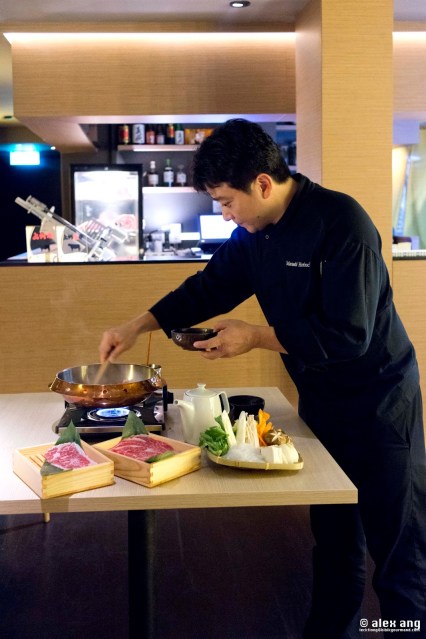 | Chef Horiuchi preparing sukiyaki with Japanese wagyu-holstein crossbreed |
