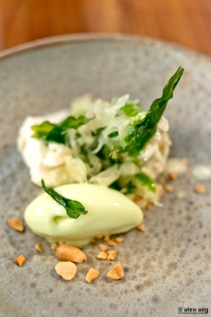 The concluding savoury dessert of laksa leaf ice cream (S$15) is one that will invite polarizing reviews. Here, laksa leaf ice cream holds court on a plate with coconut semifreddo, pomelo pulp, peanuts and a drizzle of green chilli sauce. This is an inspiring assembly to say the least but, as they say, beauty is in the eye of the beholder and not everyone will take to the unusual marriage. We reckon a stronger dose of citrus flavour will give the dessert a whole new dimension (3.75/5)