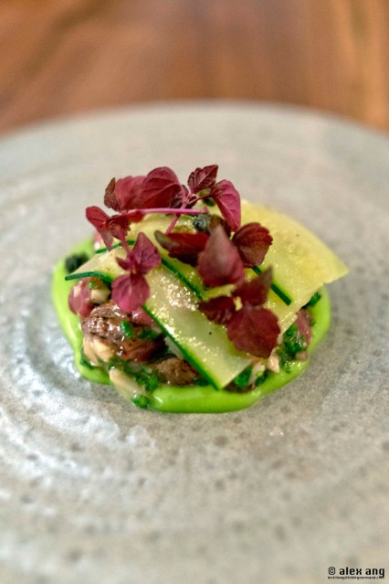 Wild New Zealand venison tartare (S$22) follows. To set it apart from the garden-variety tartare, Naleendra introduces shallots, shiso leaves and pickled cashew nuts, and instead of using the ubiquitous Worcestershire sauce, the young chef home makes a fermented plum dressing that gives it an exhilarating lift. Below the mound sits a pool of wasabi-spiked zucchini puree that awakens the palate, yet the sensation from the Japanese horseradish is one of gleeful satisfaction rather than shock. (4.5/5)
