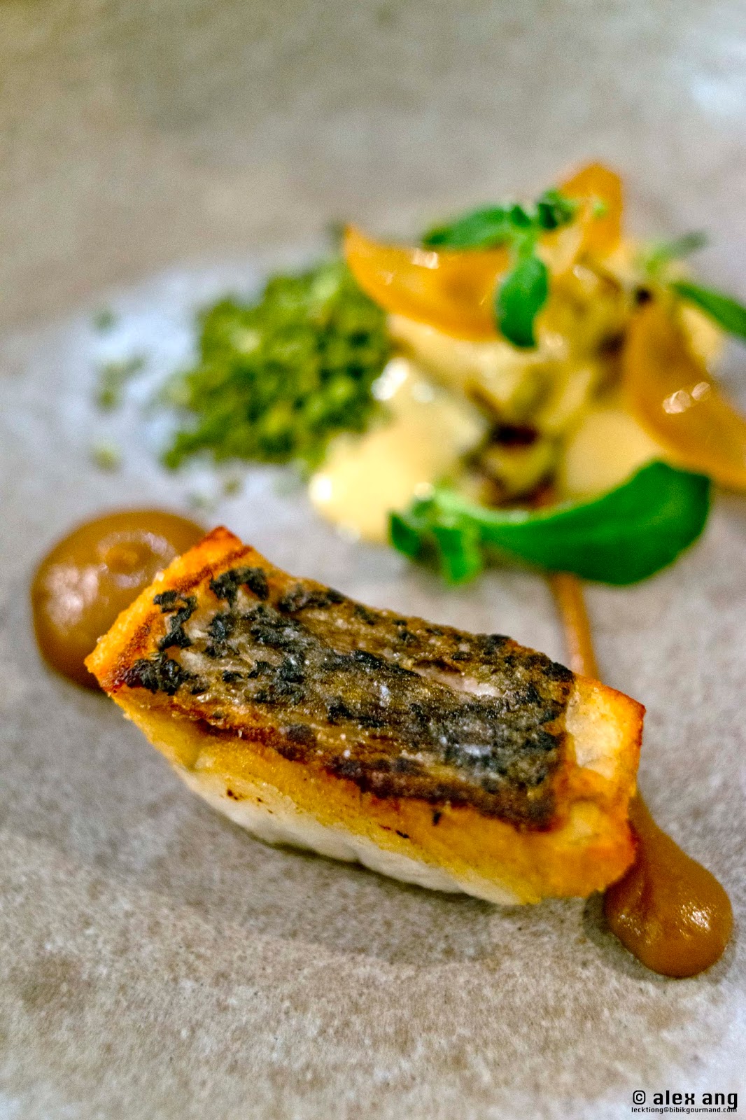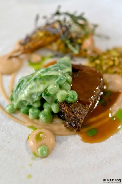 Remarkably, the ensuing fish dish continues to keep things interesting for the diner. The Kuhlbarra barramundi arrives perfectly seared, albeit a little dry, with smidgens of caramelized onion puree, a puddle of savoury bonito butter, some kombu-seasoned puffed Japanese rice and wisps of toothsome braised-charred leek. Its overall appeal is one of umami with a hint of savoury richness from the bonito butter. (4.25/5)