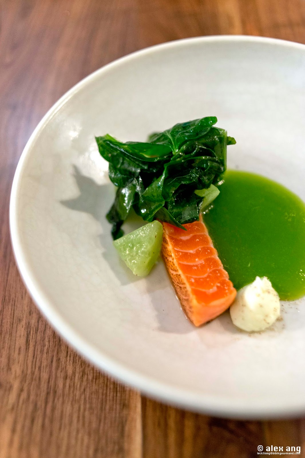 Then, Naleendra seizes your attention with a stunning opening dish of ocean trout (S$22). The New Zealand-sourced fish is cured for 24 hours and served in pool of refreshing cucumber sauce alongside a dollop of palate-arresting whipped buttermilk perfumed with yuzu. On the side are leaves of olive oil-compressed spinach, which provide delicious moments of olive oil-scented relief from the salty-sweet-citrusy combo. (4.5/5)