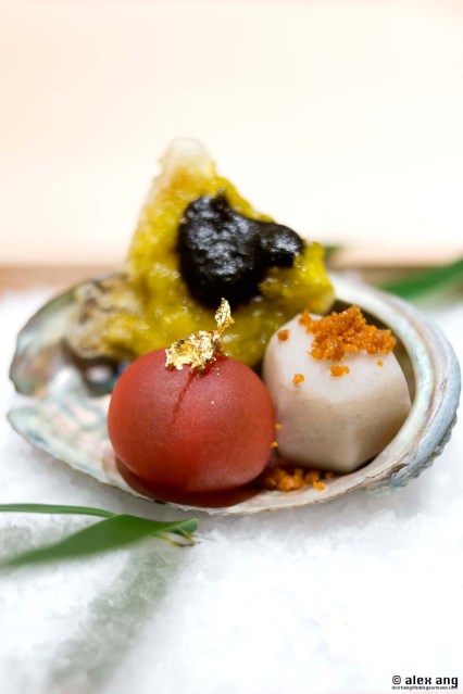 | Starter – tempura style abalone, fruit tomato, Japanese yam topped with karasumi |
