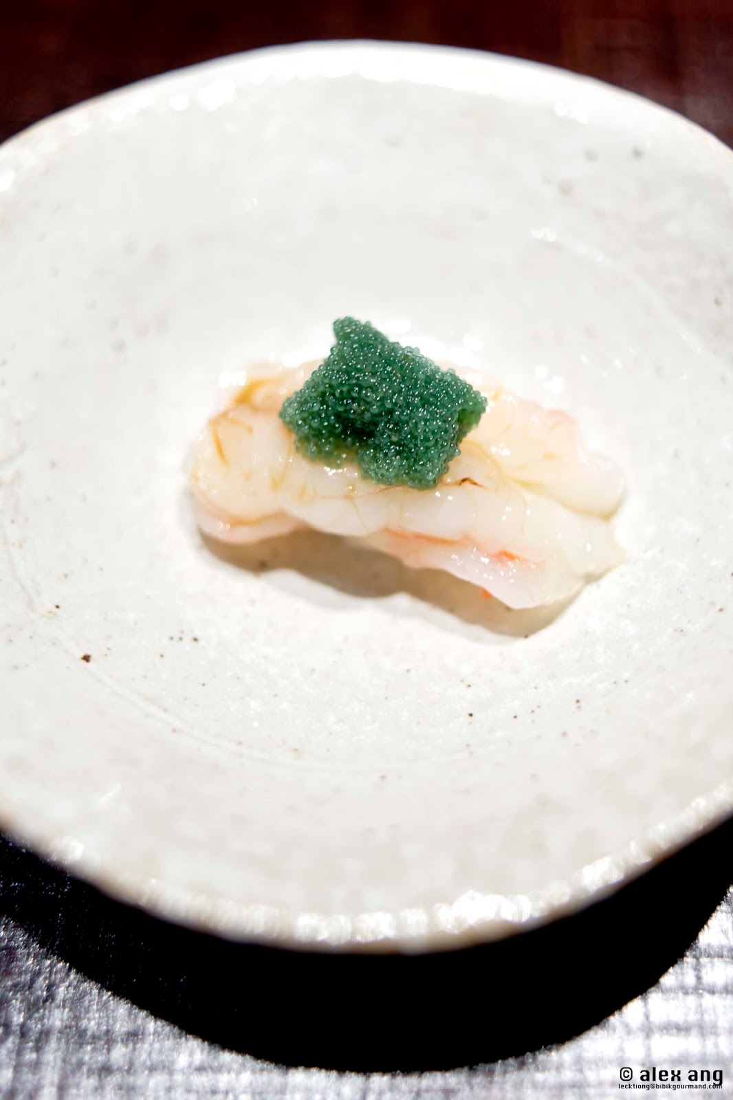 Glistening botan ebi crowned with pearls of coral-hued ebi roe that were brushed with soya and plum sauce.