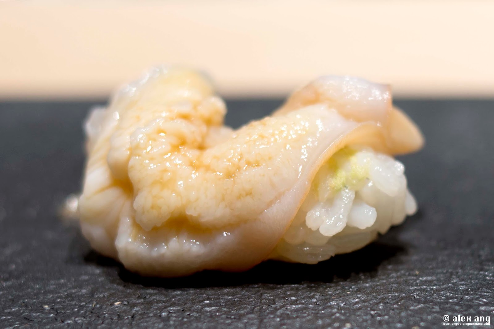 Also torched kamasu (baby barracuda) bearing a delicate char for a bit of smoky finish to an otherwise light and sweet fish, served with a refreshing dollop of grated daikon.