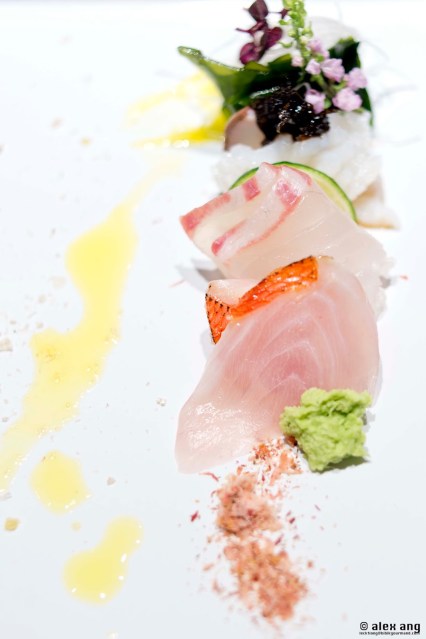 | Sashimi of mizu tako, kinmedai with seaweed, smoked salt, tea oil, ebi powder and wasabi |