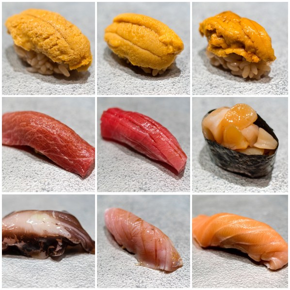 Yes, Hamamoto serves a parade of sushi for the rice course. For the shari, he uses a mixture of three different types of rice, and for the neta, he sometimes prefers to age the fish so as to bring out its umami. Kinmedai, for example, is aged for 10 days before Hamamoto slices it and serves it as a sushi; same for the otoro from a 430kg fish from Chiba, in season for just a month, which Hamamoto ages for a month. But sakura-masu (sakura trout), in season only from end March to April, is served as it is atop a parcel of rice, as is the refreshingly crunchy torigai (Japanese cockle) that arrives with a squeeze of lemon juice.