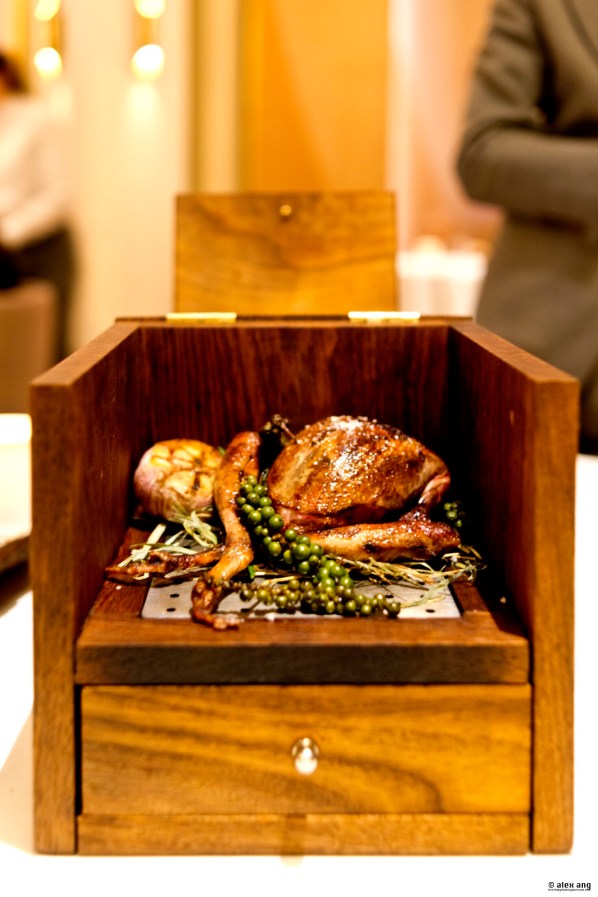 A meal at Odette is never complete without a handful of Royer’s French standouts prepared almost completely with European ingredients. You would be familiar with the Brittany pigeon by Monsieur Fabien Deneour but this time, Royer ups his ante on presentation by showcasing the grilled-then-smoked bird in a handmade wooden box in-built with a smoking chamber below. The pigeon’s breast arrives flecked with delicately aromatic Kampot pepper alongside textures of Jerusalem artichoke and an airy aged sherry vinegared parfait of the bird’s liver while its crisp leg is flanked by a trio of skewered pigeon hearts. While the presentation is impressive, you have to eat this to know why it remains a Royer icon till today.