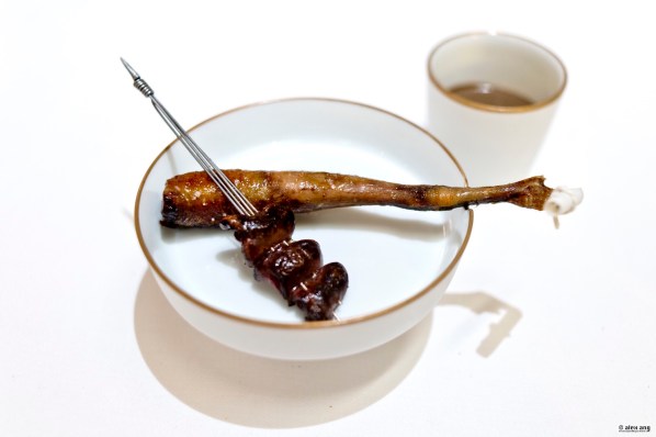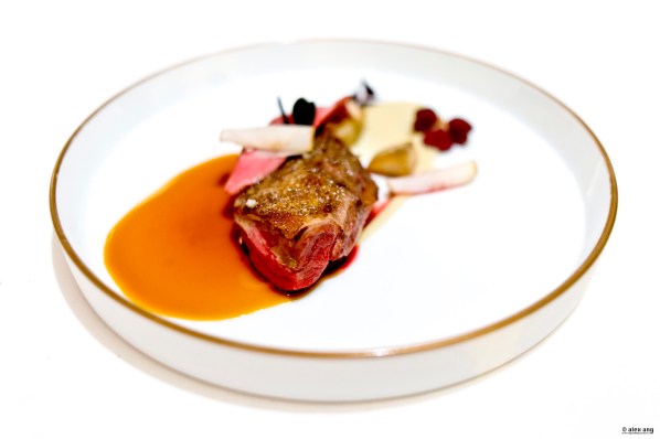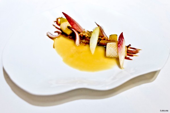 Sashimi-grade yari ika (spear squid) from Kyushu is delicately char-grilled and served with a leaf of miso-glazed braised endive, burnt orange segments, toasted buckwheat and counterpointed with smidgens of miso caramel. As if this unusual pairing is not enough to seize your attention, Royer comes by for a finishing pour of reduced sake beurre blanc sauce perfumed with orange jus for a rounded hint of acidity, proving once again that French-Japanese can be a hit if done right.
