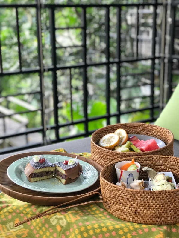There are only two food & drinks establishments here. The Dining room is the defacto spot for breakfast, lunch and dinner. At breakfast, it serves a choice of American, Indonesian or Japanese sets as well as an a la carte menu. Given that a Japanese chef is at the helm, it makes sense to go Japanese for breakfast (expect grilled fish with rice or porridge, onsen egg, miso soup and condiments), although we hear the Indonesian set of bubur ayam with yellow Balinese soup is a standout. At dinner, the Dining room also serves a contemporary Balinese tasting menu featuring dishes like soto ayam, chawanmushi with dessicated coconut and wagyu in kecap manis. For a change, Cafe Gazebo serves a rattan picnic breakfast of terang bulan (Indonesisn pancake with black glutinous rice and dessicated coconut) with fresh fruits, salad and drip coffee. Even if you can’t be here for breakfast (7 to 11am), come for coffee, tea or just snacks as it is opened till 8pm. It’s one of the highlights of this property.