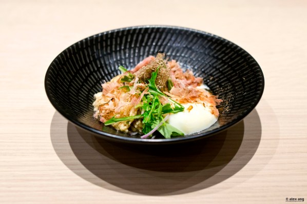 As if to balance the delicateness of the carpaccio, Adachi sends his most rustic dish yet – slivers of thinly sliced wagyu dipped ”shabu shabu” style in an earthern pot of dashi by the counter. The wagyu itself, it’s suitably impressive, if a little cold, but the Japanese chef pairs the protein with a disc of onsen egg and a sticky puddle of tororo (grated and chopped mountain yam) muddled with citrus-pickled vegetables, freshly shaved bonito flakes and a dash of dashi. If the richness of the wagyu and egg ever gets to you, know that it is rightly tempered by the earthiness of the mountain yam, lifted by acidity of the pickles and buffered by the refined umami of the dashi.