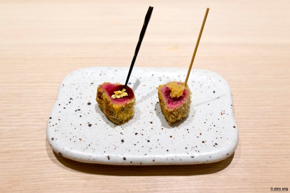For the fried (agemono) course, you are served a pair of rare on the inside and lightly crusted on the outside wagyu cutlets (katsu) – one drizzled with tonkatsu sauce and leaves of edible gold flakes and another, in fact more outstanding one, with a punchy, slightly spicy, daikon spiked with yuzu chilli pepper.