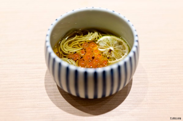 The other reason why this menu is stellar is how Adachi paces his wagyu courses with interesting in-betweens. Like the ”ate” snack of fermented western and Japanese ingredients-camembert marinated in saikyo miso (sweet white) and Danish blue cheese in moromi miso (barley) paired with a shot of sake from Hyogo prefecture. Also, a cup of chilled somen set apart from its somen brethren by the reduced sake broth streaked with ikura that coddles the oodles of fine noodles.
