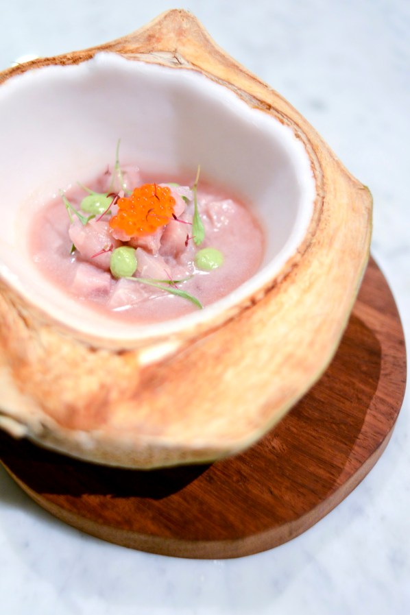 The Peruvians have ceviche, the Mexicans aguachile (for chilli water) and El Mero Mero the hamachi and coconut ceviche ($21). Here, cubes of sashimi-grade hamachi are first treated with lime juice and fresh chilli pepper pulp of jalapeno, serrano and guero, then further cured in a cocktail of lime juice as well as coconut water and milk simmered with hibiscus flower. The fish, now cured, is served in a halved coconut husk with dots of avocado puree and trout roe complete with the tender and succulent flesh of the coconut. Our only complaint is the lack of a spicier aguachile that could lend a spicier kick for guests with a higher tolerance to chillies.