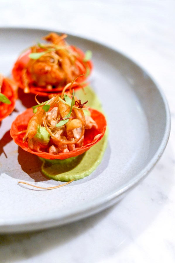 There’s also charred tostadas (toasted tortilla) on the menu served with an avocado dip of guacamole ($12/$18) that you mix at the table with diced tomatoes, onions and serrano pepper. But truth be told that the other tostada of tostadas de atun ($18) is tastier and, let’s just say, sexier – chunks of tuna tartare coddled in crisp cups of corn tortilla with punchy chipotle (roasted red jalapenos) mayo topped with even crispier tempura of banana shallots.