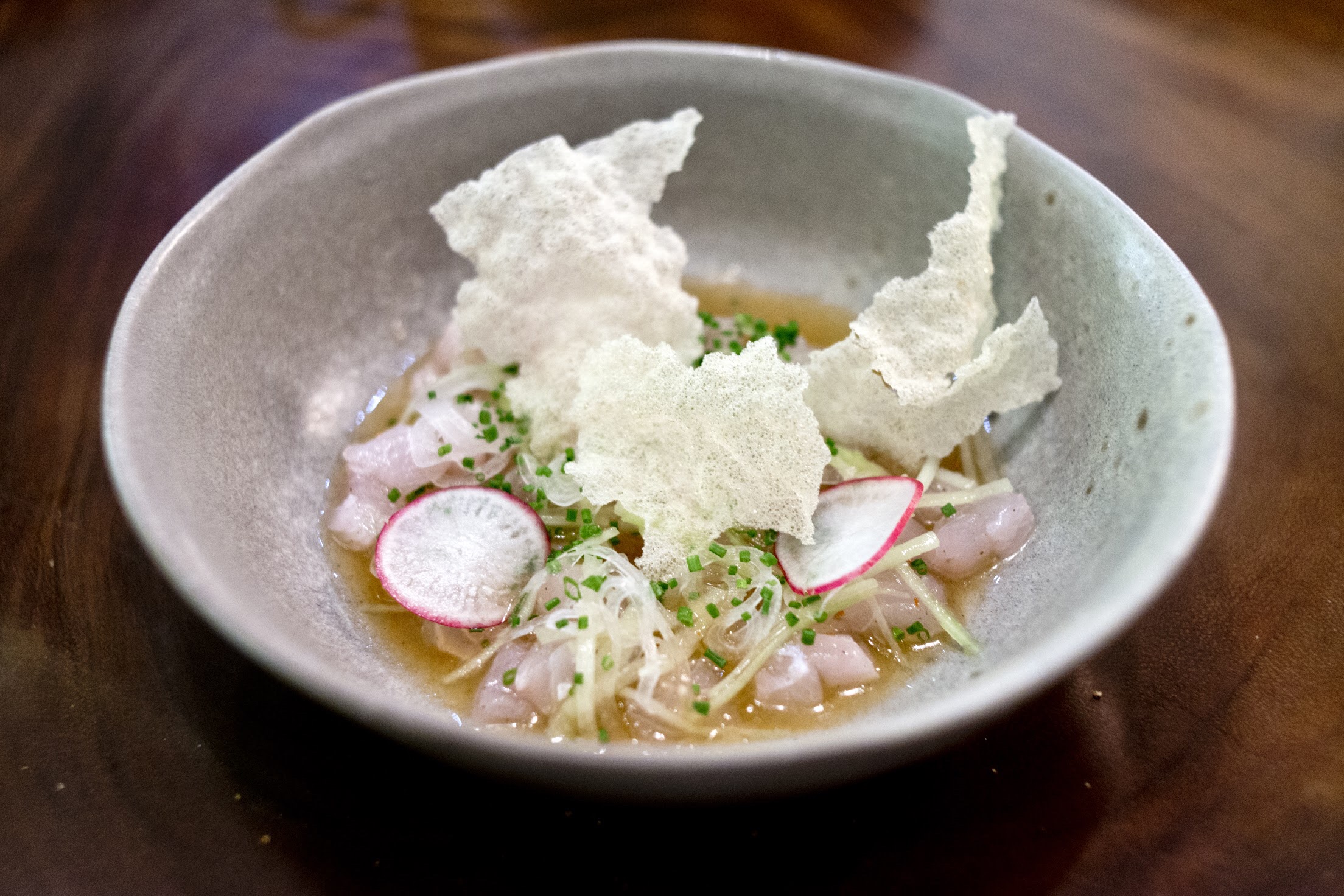 To go with your glass of Chablis, Daurelle suggests a plate of not-so-Burgundy tartare of locally farmed barramundi dressed in a spicy and sharp calamandi dressing spiked with chilli and decorated with crispy rice paper. A dish that, Daurelle admits, Soo creates for a small part of the mostly rustic Burgundy-style menu where he has a free hand.