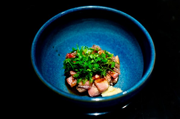 Lefebvre’s welcome snacks are off to a roaring start – thinly-sliced Kusunoki Wagyu fillet mignon steeped in a delicate oil infused with umami-packed plankton is but the chef’s way of showing you, albeit in delicate portions, what he has up his sleeves. His Cecina de León, beef “ham” that’s been salted, cured for 48 months and dried in the province of León in northwestern Spain, is smoky and smooth, rightly matched with a side of pan con tomate for a whiff of refreshment.