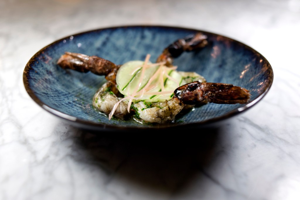 From the small plates menu, there’s a warm disc of tuna tostada (toasted tortilla) topped with barely-there cured XO sausages and shavings of foie gras. Also evenly-brown slabs of thickly toasted brioche topped with a towering mound of shredded blue swimmer crabs scented with lemon butter. But my greatest rave is reserved for the riveting dish of bincho flash-grilled butterflied red prawns ($16) served in a shallow pool of sweet and tangy aguachile spiked with jalapeno and refreshingly perfumed with torch ginger flower. That distinct smokiness that envelops the palate is transcendental.