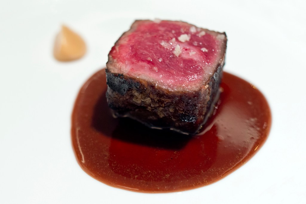 It would be a dream-come-true for gastronomes to taste authentic Basque Country txuleta in the Lion City but due to import regulation, this thought is at best a distant dream. Essentially a Flintstone-style beef from old Basque cows reared on a grass diet and slaughtered between the age of eight to 18 years old, this annuated steak is known for its “savoury flavour of great depth and complexity” or simply put “profoundly beefy beef.” Given import restrictions, Aitor serves what he considers to be next best, Robbins Island beef from Tasmania aged at source for 30 days and further aged in the restaurant’s ageing cabinet for another 15 to 30 days. The loin is grilled in the Josper oven so that its facade is charred and inside still red and served with smoked Aomori garlic mousseline and a beef jus so intense and viscous that it resembles a thick glaze. Perfect for a tasting menu even if it’s hardly the Flintstone-size txuleta that we want (and which we will never get in Singapore).